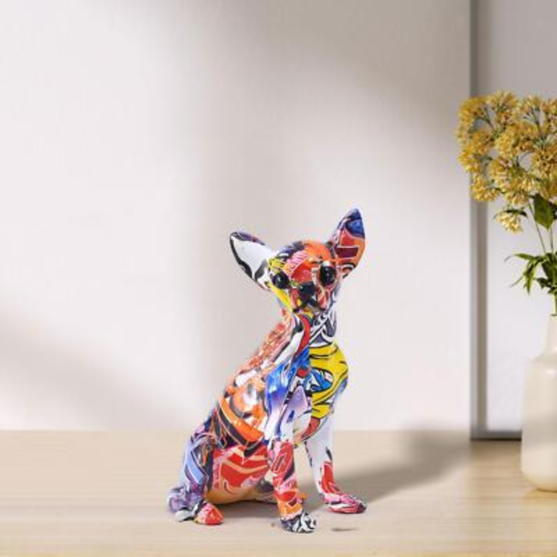 Esta escultura traduz o espírito urbano em uma peça compacta e cheia de identidade. A pintura grafite adiciona profundidade visual e transforma o chihuahua em um ícone de estilo — moderno, irreverente e sofisticado ao mesmo tempo.